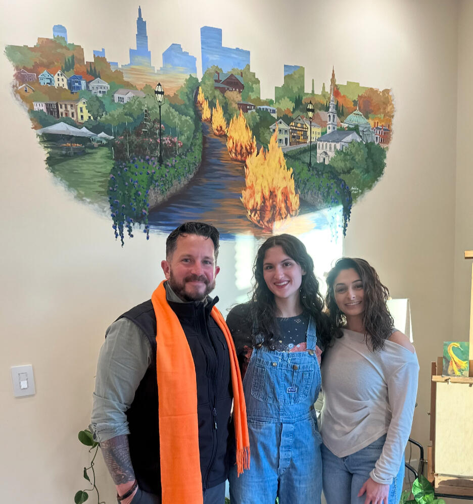 When Alan St. Pierre (above), renovated his home, he knew it needed more than fresh paint - it needed a story. As a member of the Providence Art Club and lifelong Rhode Island resident, he commissioned local artist, Madeline Menkes (center, below) to create the mural below on the wall of his home (below), Main Living Mural of Providence, transforming his space into a reflection of Rhode Island’s creative spirit.